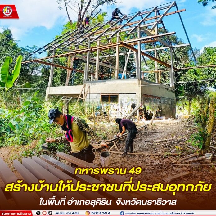 เมื่อวันที่ 1 มีนาคม 2568 เวลา 06.00 – 18.00 น. หน่วยเฉพาะกิจกรมทหารพรานที่ 49 จัดกำลังพลชุดช่างประจำกองร้อยทหารพรานที่ 4904 ลงพื้นที่เพื่อดำเนินการก่อสร้างบ้านให้กับครอบครัวที่ประสบอุทกภัยจากเหตุการณ์ดินสไลด์ ณ บ้านเลขที่ 90 หมู่ที่ 3 ตำบลมาโมง อำเภอสุคิริน จังหวัดนราธิวาส เพื่อฟื้นฟูชีวิตความเป็นอยู่ของประชาชนที่ได้รับผลกระทบจากภัยพิบัติทางธรรมชาติ โดยเฉพาะบ้านของ นางดอปือเสาะ สะอะ ซึ่งได้รับความเสียหายจากเหตุการณ์ดินสไลด์เมื่อวันที่ 25 ธันวาคม 2567 ที่ผ่านมา