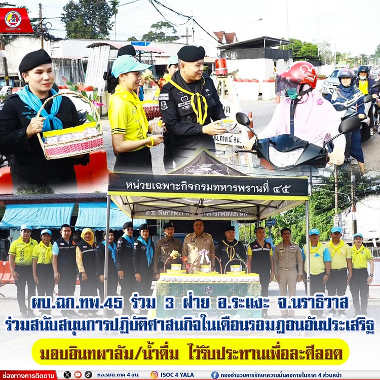 เมื่อวันที่ 3 มีนาคม 2568 เวลา 16.30 น. ที่บริเวณจุดอำนวยความสะดวก ด่านตรวจตันหยงมัส ตำบลตันหยงมัส อำเภอระแงะ จังหวัดนราธิวาส พันเอก สุรศักดิ์ พึ่งแย้ม ผู้บังคับหน่วยเฉพาะกิจกรมทหารพรานที่ 45 พร้อมด้วย นายวิมุตติ อำนักมณี นายอำเภอระแงะ, ผู้แทน สภ.ระแงะ, กำลังพลจิตอาสา และชุดปฏิบัติการกิจการพลเรือนของหน่วยฯ ร่วมมอบอินทผาลัมและน้ำดื่ม ให้กับประชาชนที่สัญจร เส้นทางบริเวณหน้ากองบังคับการหน่วยเฉพาะกิจกรมทหารพรานที่ 45 อำเภอระแงะ จังหวัดนราธิวาส เพื่อไว้รับประทานละศีลอดในเดือนรอมฎอนอันประเสริฐ ประจำปี 2568 ฮิจเราะห์ศักราช 1446 โดยการถือศีลอดเป็น 1 ใน 5 ประการ หลักปฏิบัติของศาสนาอิสลาม ทั้งนี้ ได้กำหนดแผนการมอบอินทผาลัม ในทุกวันอังคาร พุธ พฤหัสบดี ของสัปดาห์ ตลอดห้วงเดือนรอมฎอน