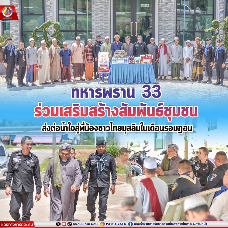 การพบปะครั้งนี้เพื่อเสริมสร้างความสัมพันธ์อันดี แลกเปลี่ยนความคิดเห็น และหารือแนวทางการปฏิบัติที่เกี่ยวข้องในช่วงเดือนรอมฎอน นอกจากนี้หน่วยเฉพาะกิจกรมทหารพรานที่ 33 ยังได้มอบอินทผาลัมและเครื่องอุปโภคบริโภคให้แก่ผู้นำศาสนา เพื่อนำไปแจกจ่ายให้ประชาชนใช้ในการละศีลอด (เปิดปอซอ) และสนับสนุนการปฏิบัติศาสนกิจของพี่น้องชาวไทยมุสลิมในพื้นที่ ให้สามารถปฏิบัติศาสนกิจในเดือนรอมฎอนได้อย่างสมบูรณ์ สะท้อนถึงความร่วมมือและความเข้าใจอันดีที่มีต่อกันในพื้นที่ต่อไป
