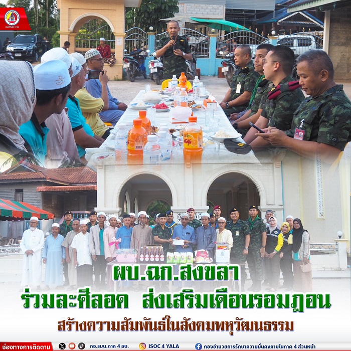 วันที่ 4 มีนาคม 2568 เวลา 18.00 น. พลตรี ทวนทอง ทองสุภา ผู้บังคับหน่วยเฉพาะกิจสงขลา นำคณะและผู้แทนจาก หน่วยเฉพาะกิจสงขลา 40 ร่วมกิจกรรม ละศีลอด กับผู้นำศาสนา ผู้นำท้องที่ ผู้นำท้องถิ่น และพี่น้องประชาชนในพื้นที่ ณ มัสยิดนูรูอีฮสาน บ้านทับยาง ตำบลคูหา อำเภอสะบ้าย้อย จังหวัดสงขลา