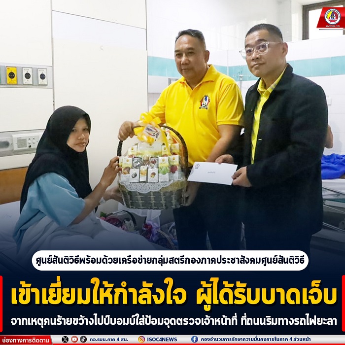 วันที่ 6 มีนาคม 2568 เวลา 15.00 น. นาวาอากาศเอก จิราสินธุ์ เกษมธนเสถียร รองผู้อำนวยการศูนย์ สันติวิธี พร้อมด้วย พันเอก ภัทรชัย แทนขำ เสนาธิการศูนย์สันติวิธี และคณะกลุ่มสตรีกองสานใจสู่สันติ ศูนย์สันติวิธี, สมาคมเด็กและเยาวชนเพื่อสันติภาพชายแดนใต้ (กลุ่มลูกเหรียง),กลุ่มสตรีตลาดเก่า ซึ่งเป็นเครือข่ายกองภาคประชาสังคมศูนย์สันติวิธี ร่วมเดินทางเข้าเยี่ยมให้กำลังใจประชาชนที่ได้รับบาดเจ็บจากเหตุการณ์คนร้ายขว้างไปป์บอมบ์ใส่ป้อมจุดตรวจเจ้าหน้าที่ ที่ถนนริมทางรถไฟฝั่งตลาดเก่าเขตเมือง อำเภอเมืองยะลา เหตุเกิดเมื่อ วันที่ 5 มีนาคม 2568 เวลาประมาณ 19.15 น.