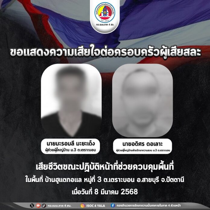 ประชาสัมพันธ์ข่าวประชาสัมพันธ์ ขอแสดงความเสียใจต่อครอบครัวผู้เสียสละทั้ง 2 ท่าน เสียชีวติขณะปฏิบัติหน้าที่ช่วยควบคุมพื้นที่ ในพื้นที่ บ้านฮูแตกอแล หมู่ที่ 3 ต.เตราะบอน อ.สายบุรี จ.ปัตตานี เมื่อวันที่ 8 มีนาคม 2568 March 11, 2025 592 Share Facebook Twitter Google+ Telegram LINE แม่ทัพภาคที่4 แม่ทัพไพศาล ศูนย์ประชาสัมพันธ์กองอำนวยการรักษาความมั่นคงภายในภาค4ส่วนหน้า