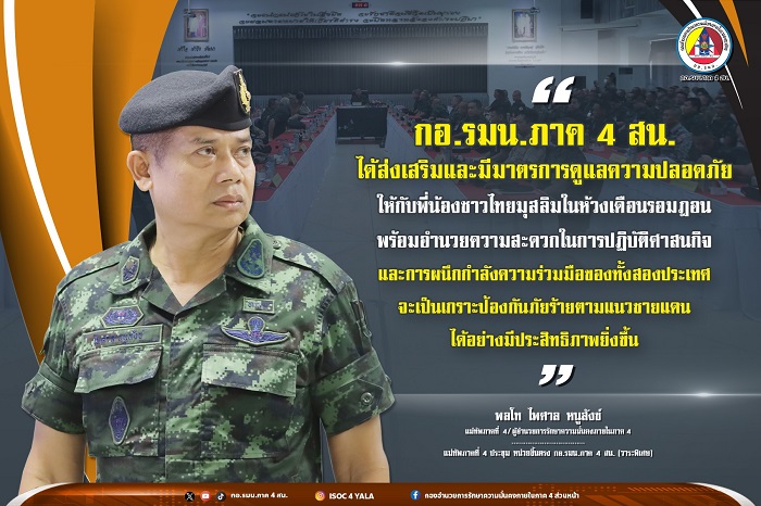 “The 4th Regional Internal Security Operations Command (ISOC) has promoted and implemented measures to ensure the safety of our Muslim Thai brothers and sisters during the month of Ramadan, while facilitating their religious practices. The strengthened cooperation between both countries will serve as a shield to protect against threats along the border, with greater efficiency.”