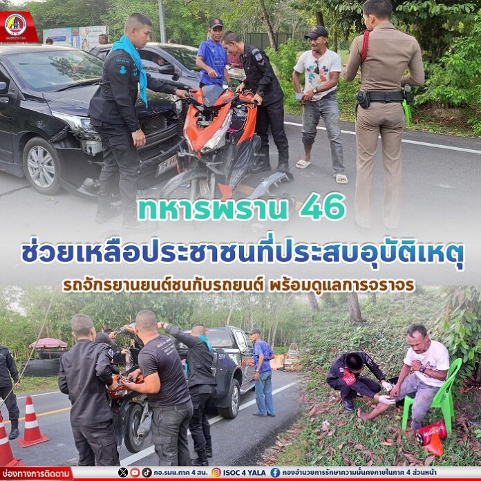 เมื่อวันที่ 13 มีนาคม 2568 เวลา 16.40 น. เจ้าหน้าที่ทหารพรานจาก กองร้อยทหารพรานที่ 4603 หน่วยเฉพาะกิจกรมทหารพรานที่ 46 นำกำลังพลชุดปฏิบัติการและจุดตรวจหน้าฐานฯ เข้าให้การช่วยเหลือประชาชนที่ประสบอุบัติเหตุชนกันระหว่างรถจักรยานยนต์และรถยนต์ บริเวณจุดตรวจหน้าฐานปฏิบัติการ ร้กองร้อยทหารพรานที่ 4603 หมู่ที่ 2 บ้านเปาะรามะ ตำบลรือเสาะออก อำเภอรือเสาะ จังหวัดนราธิวาส โดยเหตุการณ์ที่เกิดขึ้นมีผู้บาดเจ็บจากอุบัติเหตุในพื้นที่ เจ้าหน้าที่ทหารพรานได้เข้าช่วยเหลือประชาชนทันที โดยการปฐมพยาบาลเบื้องต้น พร้อมทั้งโทรแจ้งเจ้าหน้าที่ตำรวจให้เข้ามาดูแลสถานการณ์ นอกจากนี้ เจ้าหน้าที่ทหารยังได้อำนวยความสะดวกด้านการจราจรเพื่อให้รถที่สัญจรผ่านไป-มาบริเวณดังกล่าวสามารถเดินทางได้ตามปกติ