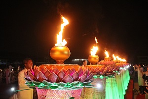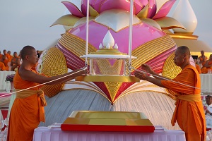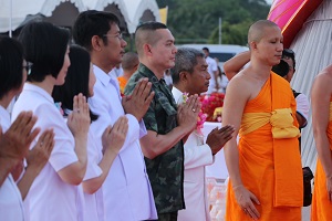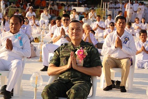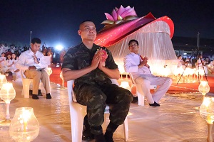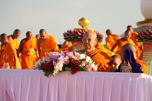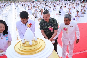Dalam upacara tersebut, Ketua Agama Pattani dan Timbalan Gabenor Pattani telah menyampaikan pelantar penghormatan kepada Somdet Phra Mahawachiramangkhalajarn, Ketua Agama Wilayah Selatan / Penasihat Majlis Agama / Abbot Wat Kaphang Surin, Kuil Kerajaan, Trang, pengerusi pihak bhikkhu. Kemudian, Timbalan Gabenor Pattani menyampaikan ucapan selamat datang kepada para bhikkhu dan umat Buddha serta merasmikan upacara pemasangan Relikui Buddha Agung di dalam Chedi Phra Phatummachedi (Chedi Buddha 5 Raja). Selepas itu, Phra Sophon Wachiranayok, Ketua Agama Pattani, memimpin doa, sementara Somdet Phra Mahawachiramangkhalajarn, pengerusi pihak bhikkhu, membawa Relikui Buddha Agung dari kereta para dewa. Para bhikkhu bersama-sama dengan umat yang hadir menyembah dan memberi penghormatan. Kemudian, pengerusi pihak bhikkhu memimpin ucapan penghormatan kepada pelita, diikuti dengan umat menyalakan pelita sebagai penghormatan kepada Buddha.