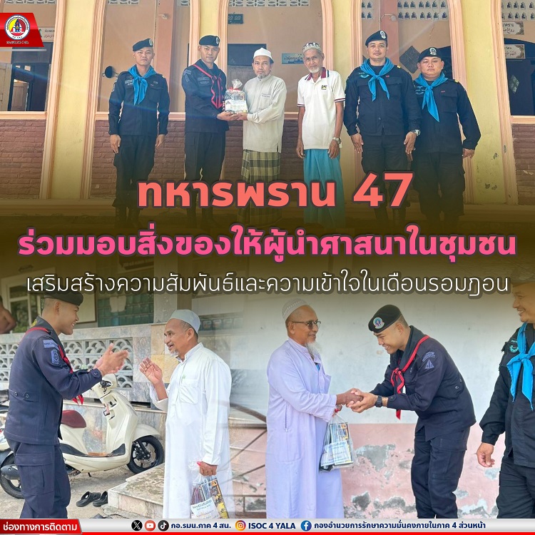 เดือนรอมฎอนถือเป็นช่วงเวลาที่สำคัญที่สุดในศาสนาอิสลาม เป็นเวลาแห่งการถือศีลอด การบำเพ็ญทาน และการสละทิ้งสิ่งที่ไม่จำเป็น เพื่อสร้างความสะอาดทั้งทางร่างกายและจิตใจ ซึ่งในปีนี้ หน่วยเฉพาะกิจกรมทหารพรานที่ 47 โดย กองร้อยทหารพรานที่ 4714 ได้มีโอกาสร่วมกิจกรรมกับชุมชนในพื้นที่จังหวัดยะลา โดยมีการพบปะและพูดคุยกับผู้นำศาสนาประจำมัสยิดในพื้นที่ต่าง ๆ อาทิ มัสยิดบาโงยีรา หมู่ที่ 1 และมัสยิดตะโล๊สะโตร์ หมู่ที่ 6 ตำบลสะเอะ อำเภอกรงปินัง