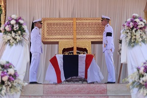 During the ceremony, General Prince Chalermseuk Yukol placed a monk’s robe on the coffin. Five monks performed the prayers, after which His Royal Highness placed a tray of rice offerings and sandalwood flowers in front of the coffin before conducting the royal cremation ceremony.