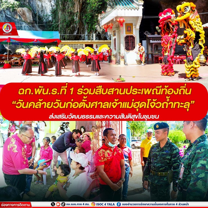 วันที่ 17 มีนาคม 2568 เวลา 10.00 น. พันโท ภานุพงศ์ ชนะวรรณโณ รองผู้บังคับหน่วยเฉพาะกิจกองพันทหารราบที่ 1 พร้อมด้วยกำลังพลของหน่วย ร่วมกับส่วนราชการและภาคส่วนต่าง ๆ รวมถึงพี่น้องประชาชนชาวไทยพุทธเชื้อสายจีนในพื้นที่ ร่วมประเพณีท้องถิ่นที่สำคัญ “วันคล้ายวันก่อตั้งศาลเจ้าแม่ฮุดโจ้วถ้ำทะลุ” หรือ “วันเกิด” ณ ศาลเจ้าแม่ฮุดโจ้วถ้ำทะลุ หมู่ที่ 1 ตำบลถ้ำทะลุ อำเภอบันนังสตา จังหวัดยะลา ซึ่งเป็นประเพณีที่มีความหมายลึกซึ้งต่อชุมชนและประชาชนในพื้นที่ที่ไม่เพียงแต่เป็นศูนย์กลางทางศาสนา แต่ยังเป็นที่ที่ผู้คนจากหลากหลายภาคส่วนมารวมตัวกันเพื่อสร้างความสัมพันธ์ที่ดีต่อกัน