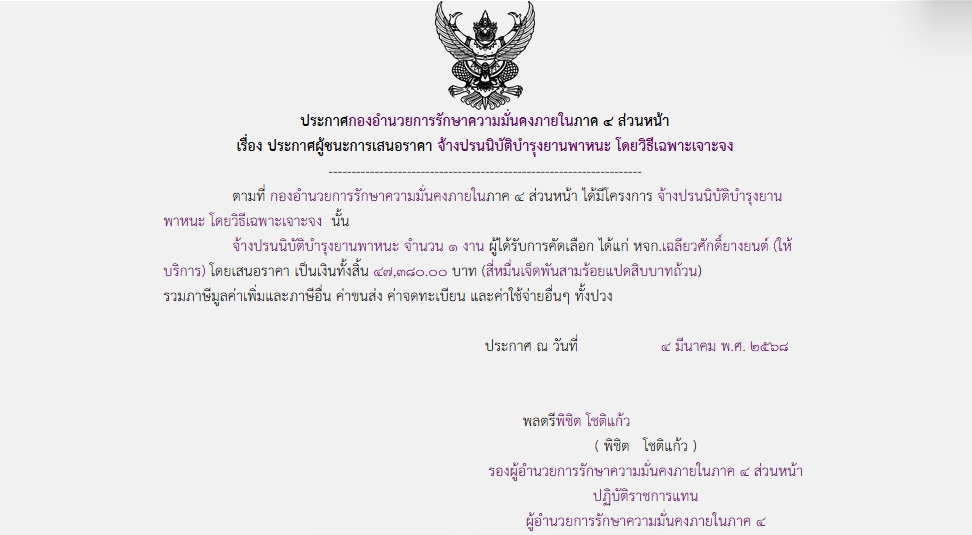 ประกาศผู้ชนะการเสนอราคา จ้างปรนนิบัติบำรุงยานพาหนะ โดยวิธีเฉพาะเจาะจง