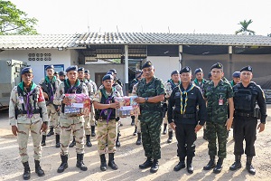 In the afternoon at 4:00 PM, Colonel Yuthanam Petchmuang, Deputy Commander of the Yala Task Force, along with his team, visited the protection unit at Bannang Sata subdistrict. They listened to a briefing from local officers on the ongoing operations to emphasize the importance of monitoring the movement of violent perpetrators both within and outside the area. The briefing also included directives from the leadership to intensify operations and enhance protective measures for operational bases. During the visit, consumables were also distributed as morale boosters to the officers working diligently and selflessly in the area.