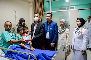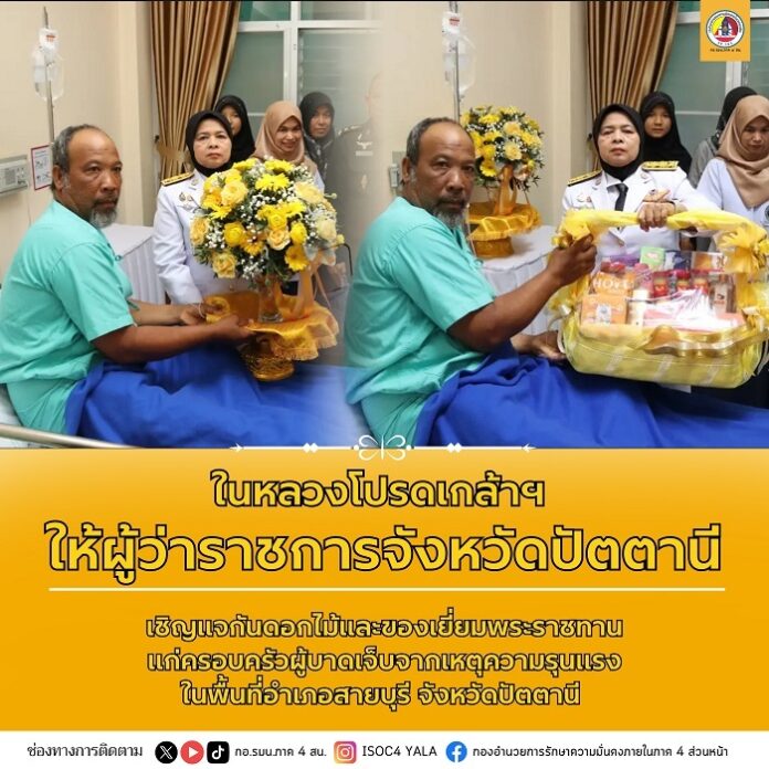 On March 20, 2568, at 13:30, at Somdej Phra Yupparat Sai Buri Hospital, Taluban Subdistrict, Sai Buri District, Pattani Province, His Majesty the King graciously instructed Mrs. Pateema Sadiyamu, the Governor of Pattani Province, to deliver a bouquet of flowers and royal gifts from His Majesty the King and Her Majesty the Queen to the family of Mr. Mayuso Saleemah, who was injured in the incident when an assailant threw a homemade bomb at a security checkpoint in front of Liab Temple, Taluban Subdistrict, Sai Buri District, Pattani Province, on March 19, 2568. The incident caused Mr. Mayuso, who was riding a sidecar motorcycle with his family, to be injured and admitted to Somdej Phra Yupparat Sai Buri Hospital for treatment.
