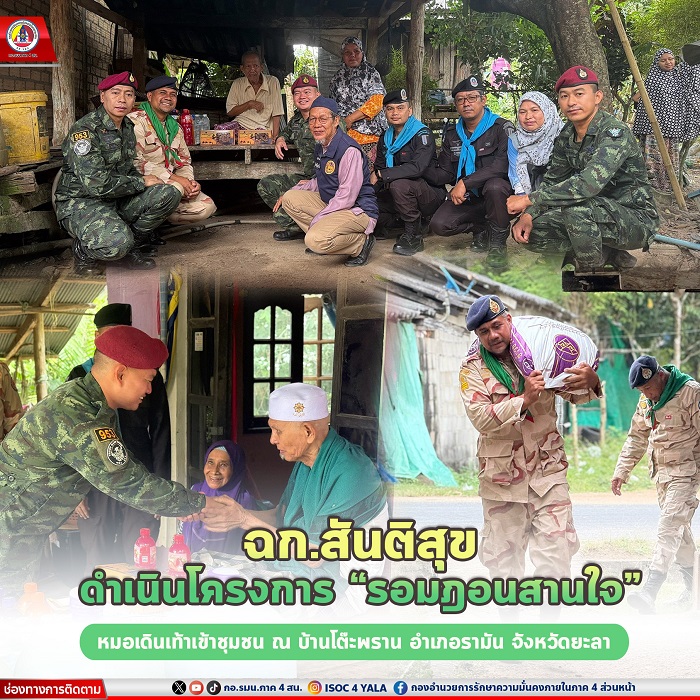 ในช่วงเดือนรอมฎอนปีนี้ หน่วยเฉพาะกิจสันติสุข ได้จัดกิจกรรมเพื่อเสริมสร้างความสัมพันธ์อันดีระหว่างเจ้าหน้าที่รัฐและประชาชนในพื้นที่จังหวัดชายแดนภาคใต้ โดยการดำเนินโครงการ “รอมฎอนสานใจ” ซึ่งเน้นการช่วยเหลือประชาชนและบรรเทาทุกข์ในชุมชนในช่วงเวลาที่สำคัญนี้ โดย ชุดสันติสุขที่ 302 ร่วมกับ ชุดทักษิณสัมพันธ์ที่ 331, เจ้าหน้าที่ทหารพรานจากกองร้อยทหารานที่ 4115 หน่วยเฉพาะกิจกรมทหารพรานที่ 41, สมาชิกกองอาสารักษาดินแดนจังหวัดชายแดนภาคใต้ ตำบลท่าธง และผู้นำชุมชนในพื้นที่ ได้ร่วมกันจัดโครงการ “รอมฎอนสานใจ” ภายใต้การดำเนินการกิจกรรม “หมอเดินเท้า” โดยได้เข้าไปให้บริการทางการแพทย์ ณ บ้านโต๊ะพราน หมู่ที่ 1 ตำบลท่าธง อำเภอรามัน จังหวัดยะลา โดยไม่เพียงแต่ให้การรักษาพยาบาลเท่านั้น แต่ยังมีการแจกถุงยังชีพให้แก่ผู้สูงอายุและกลุ่มเปราะบางที่ยากไร้ในชุมชน