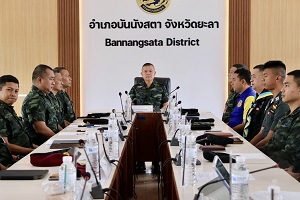 On March 23, 2025, at 08:55 AM, at the Bannang Sata District Office, Yala Province, Brigadier General Woradet Dechraksa, Deputy Commander of the 4th Army Region / Deputy Director of Internal Security Operations Command, Region 4 Forward, along with the commanding team, visited the area to monitor the overall situation in Yala province. The group included senior commanders, the executive team of the Internal Security Operations Command, Region 4 Forward, district chiefs, district operation center directors, district officers, department heads, and relevant personnel to reinforce and increase security measures.