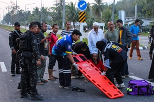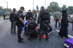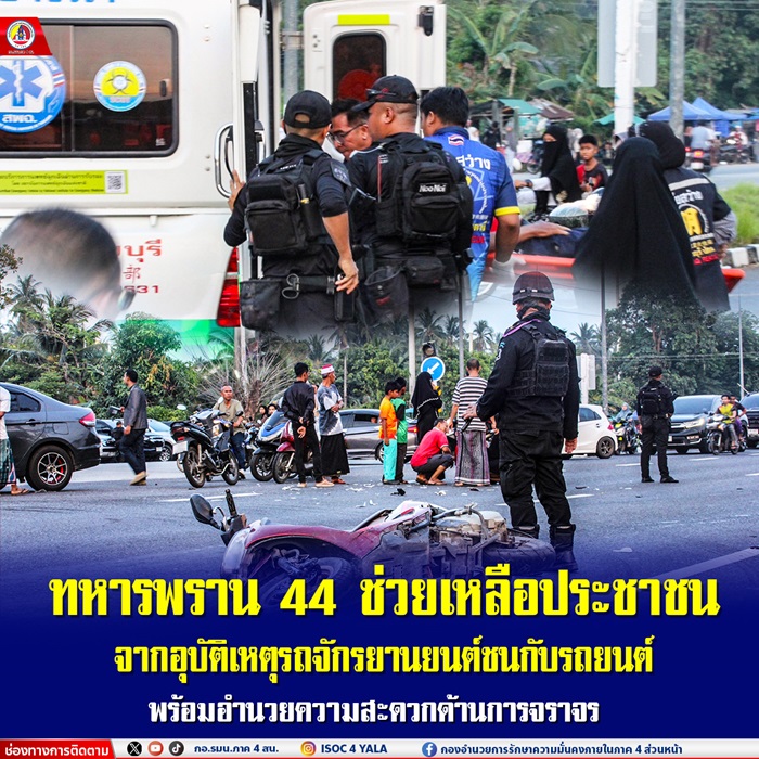 เมื่อวันที่ 27 มีนาคม 2568 เวลา 17.40 น. หน่วยเฉพาะกิจกรมทหารพรานที่ 44 ได้รับแจ้งเหตุจากประชาชนว่าเกิดอุบัติเหตุรถจักรยานยนต์ชนกับรถยนต์ ในพื้นที่ ตำบลเตราะบอน อำเภอสายบุรี จังหวัดปัตตานี หลังจากนั้นเจ้าหน้าที่หน่วยเฉพาะกิจกรมทหารพรานที่ 44 ได้จัดกำลังพลจาก กองร้อยทหารพรานที่ 4411 และ ชุดปฏิบัติการพิเศษ เดินทางไปยังจุดเกิดเหตุทันทีเพื่อให้การช่วยเหลืออย่างเร่งด่วน เมื่อเจ้าหน้าที่ถึงที่เกิดเหตุ พบว่ามีผู้ได้รับบาดเจ็บ 1 ราย ซึ่งเป็นผู้ขับขี่รถจักรยานยนต์ ท่ามกลางสภาพการจราจรที่ติดขัด เนื่องจากยานพาหนะที่เกิดอุบัติเหตุปิดกั้นเส้นทางหลัก เจ้าหน้าที่จึงได้ดำเนินการให้การช่วยเหลือเบื้องต้นโดยการปฐมพยาบาลผู้บาดเจ็บอย่างเร่งด่วน พร้อมทั้งอำนวยความสะดวกในการจราจร เพื่อป้องกันไม่ให้เกิดอุบัติเหตุซ้ำซ้อน ในระหว่างนั้น เจ้าหน้าที่ได้ประสานงานกับหน่วยกู้ภัยและเจ้าหน้าที่โรงพยาบาลในพื้นที่ เพื่อให้การเคลื่อนย้ายผู้บาดเจ็บไปยังโรงพยาบาลได้โดยเร็วที่สุด นอกจากนี้ยังมีการเปิดเส้นทางจราจรให้กับรถยนต์ที่เดินทางผ่านไปมา เพื่อไม่ให้การจราจรติดขัดยืดเยื้อและเพื่อความปลอดภัยของประชาชน