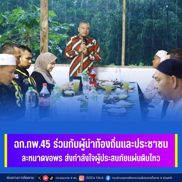 เมื่อวันที่ 28 มีนาคม 2568 เวลา 18.00 น. พันเอก สุรศักดิ์ พึ่งแย้ม ผู้บังคับหน่วยเฉพาะกิจกรมทหารพรานที่ 45 พร้อมด้วย ร้อยเอก บุญทวี บุญแก้ว หัวหน้าฝ่ายกิจการพลเรือน หน่วยเฉพาะกิจกรมทหารพรานที่ 45 ร่วมกับผู้นำศาสนา ผู้นำท้องถิ่น ผู้นำท้องที่ และประชาชนในพื้นที่ ละหมาดขอดุอาร์ ขอพรให้พี่น้องชาวไทยและครอบครัวที่ได้รับผลกระทบจากเหตุการณ์แผ่นดินไหวในประเทศไทย