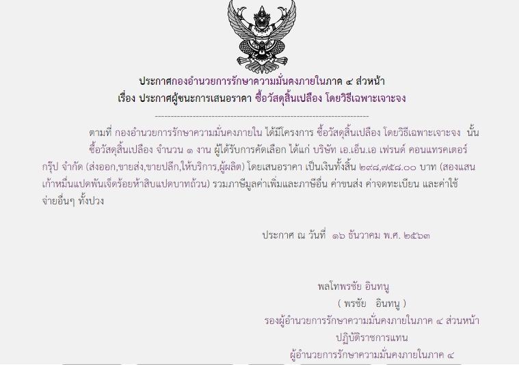 ประกาศผู้ชนะการเสนอราคา ซื้อวัสดุสิ้นเปลือง โดยวิธีเฉพาะเจาะจง (298,758.00)