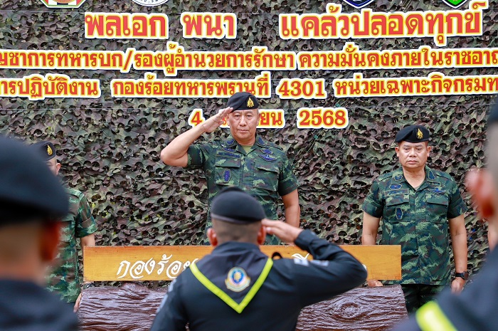 วันนี้ (4 เมษายน 2568) เวลา 13.45 น. ณ กองร้อยทหารพรานที่ 4301 ตำบลนาประดู่ อำเภอโคกโพธิ์ จังหวัดปัตตานี พลเอก พนา แคล้วปลอดทุกข์ ผู้บัญชาการทหารบก / ผู้บัญชาการศูนย์ปฏิบัติการกองทัพบก / รองผู้อำนวยการรักษาความมั่นคงภายในราชอาณาจักร พร้อมคณะผู้บังคับบัญชาฯ ลงใต้ เดินทางตรวจเยี่ยมกำลังพล กองร้อยทหารพรานที่ 4301 หน่วยเฉพาะกิจกรมทหารพรานที่ 43 พร้อมรับฟังการบรรยายสรุป ติดตามผลการปฏิบัติงาน และร่วมพบปะกำลังพลสร้างขวัญกำลังใจในการปฏิบัติหน้าที่ โดยมี พลโท ไพศาล หนูสังข์ แม่ทัพภาคที่ 4 / ผู้อำนวยการรักษาความมั่นคงภายในภาค 4, พลตรี วรเดช เดชรักษา รองแม่ทัพภาคที่ 4 / รองผู้อำนวยการรักษาความมั่นคงภายในภาค 4 ส่วนหน้า, พลตรี ขจรศักดิ์ อินทร์ทอง ผู้บังคับหน่วยเฉพาะกิจปัตตานี ตลอดจนผู้บังคับบัญชาและกำลังพลร่วมให้การต้อนรับฯ