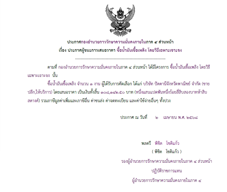 ประกาศผู้ชนะการเสนอราคา ซื้อน้ำมันเชื้อเพลิง โดยวิธีเฉพาะเจาะจง