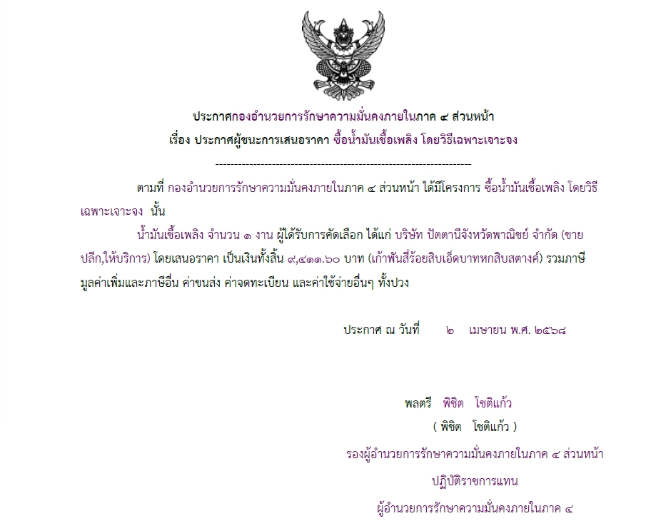 ประกาศผู้ชนะการเสนอราคา ซื้อน้ำมันเชื้อเพลิง โดยวิธีเฉพาะเจาะจง