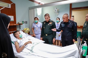 สำหรับการเดินทางเยี่ยมให้กำลังใจในครั้งนี้ แม่ทัพภาคที่ 4/ผู้อำนวยการรักษาความมั่นคงภายในภาค 4 ได้พูดคุยพร้อมมอบกระเช้าเยี่ยมป่วยและเงินบำรุงขวัญ จำนวน 4 ราย ประกอบด้วย สมาชิกกองอาสารักษาดินแดน ซูรยานี ซีบะ สังกัดกองอาสารักษาดินแดนอำเภอกะพ้อ , สิบตำรวจโท ธนภัทร ทองชัย สังกัดสถานีตำรวจภูธรศรีสาคร , อาสาสมัครทหารพราน มูหมัดอารอพัด ปิ สังกัดหน่วยเฉพาะกิจกรมทหารพรานที่ 49 และ ปลัด เต็มดวง วงศา สังกัด องค์การบริหารส่วนตำบลดอนทราย อำเภอไม้แก่น จังหวัดปัตตานี