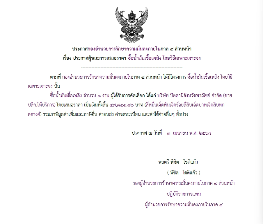 ประกาศผู้ชนะการเสนอราคา ซื้อน้ำมันเชื้อเพลิง โดยวิธีเฉพาะเจาะจง