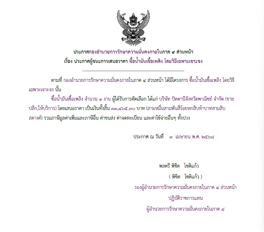 ประกาศผู้ชนะการเสนอราคา ซื้อน้ำมันเชื้อเพลิง โดยวิธีเฉพาะเจาะจง