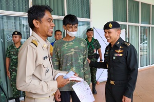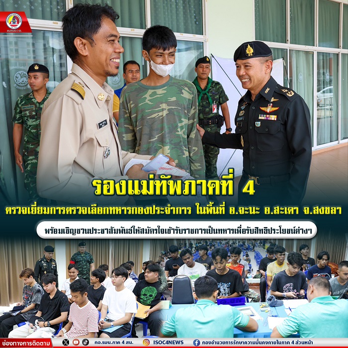 โอกาสนี้ พลตรี ชาคริต อุจะรัตน รองแม่ทัพภาคที่ 4 / รองผู้อำนวยการรักษาความมั่นคงภายในภาค 4 ส่วนหน้า ได้ไปตรวจเยี่ยมให้กำลังใจชายไทยที่เข้ารับการตรวจเลือกทหารกองเกินเข้ารับราชการทหารกองประจำการ ปี 2568 ในพื้นที่ของอำเภอจะนะ และอำเภอสะเดา จังหวัดสงขลา พร้อมกับเยี่ยมให้กำลังใจผู้ปกครองญาติพี่น้องที่มาคอยให้กำลังใจพร้อมกับได้เชิญชวนประชาสัมพันธ์เสริมสร้างความเข้าใจเกี่ยวกับสิทธิสวัสดิการ และประโยชน์ต่างๆของการเข้ารับราชการเป็นทหารกองประจำการ เพื่อเป็นข้อมูลในการตัดสินใจของชายไทยรวมไปถึงผู้ปกครองในการสมัครเข้ารับราชการทหาร ทั้งนี้สำหรับการตรวจเลือกทหารกองเกิน เข้ารับราชการเป็นทหารกองประจำการ ในส่วนของกองทัพภาคที่ 4 แม่ทัพภาคที่ 4 /ผู้อำนวยการรักษาความมั่นคงภายในภาค 4 ได้ให้นโยบายสำหรับการตรวจเลือกทหารกองเกิน ของกองทัพภาคที่ 4 ไว้ว่า “การดำเนินการทุกขั้นตอนต้องมีความโปร่งใส บริสุทธิ์ ยุติธรรม ในทุกขั้นตอน และสามารถเปิดต่อสาธารณะชนได้ ซึ่งประธานกรรมการตรวจเลือกต้องกำกับดูแลการปฏิบัติอย่างใกล้ชิด“