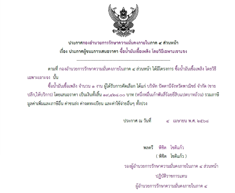 ประกาศผู้ชนะการเสนอราคา ซื้อน้ำมันเชื้อเพลิง โดยวิธีเฉพาะเจาะจง