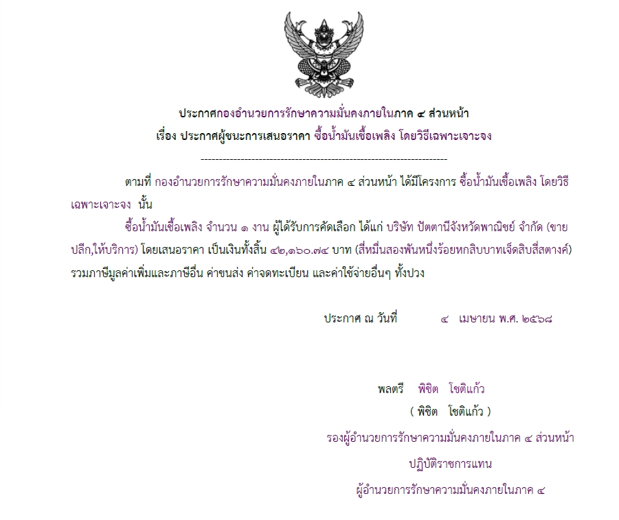 ประกาศผู้ชนะการเสนอราคา ซื้อน้ำมันเชื้อเพลิง โดยวิธีเฉพาะเจาะจง