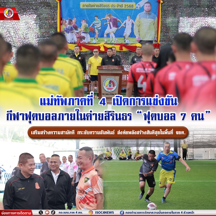 การแข่งขันฟุตบอล 7 คน ภายในค่ายสิรินธร ที่จัดต่อเนื่องมาเป็นปีที่ 3 ไม่เพียงเป็นสนามของการแข่งขันกีฬาเท่านั้น แต่ยังเป็นสนามแห่งมิตรภาพและพลังใจ กำลังพลและนักกีฬาทุกคนได้ใช้เวลาว่างอย่างมีคุณค่า สร้างสุขภาพกายใจที่แข็งแรง พร้อมเดินหน้าภารกิจด้วยหัวใจที่เปี่ยมด้วยความสามัคคี นับเป็นพลังที่ยิ่งใหญ่ ที่หล่อหลอมความหวัง และส่งต่อพลังเพื่อสร้างสันติสุขอย่างยั่งยืน