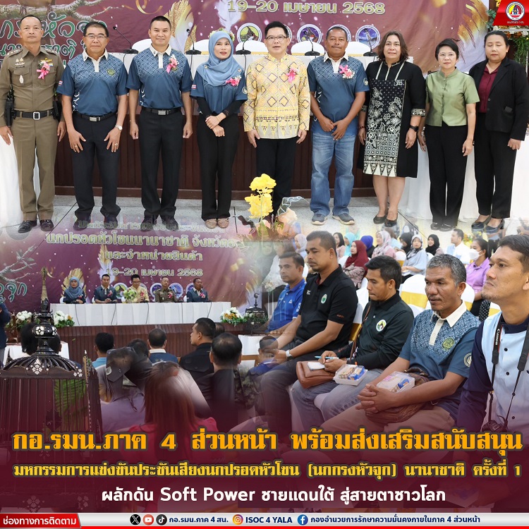 โอกาสนี้ พันเอก เกียรติศักดิ์ ณีวงษ์ หัวหน้าศูนย์ประชาสัมพันธ์ กองอำนวยการรักษาความมั่นคงภายในภาค 4 ส่วนหน้า กล่าวว่า “ กองอำนวยการรักษาความมั่นคงภายในภาค 4 ส่วนหน้า โดย พลโท ไพศาล หนูสังข์ แม่ทัพภาคที่ 4 / ผู้อำนวยการรักษาความมั่นคงภายในภาค 4 พร้อมสนับสนุนส่งเสริมอัตลักษณ์ที่ทรงคุณค่าและดีงามของพี่น้องประชาชนในพื้นที่จังหวัดชายภาคใต้ ไม่ว่าจะเป็นศิลปวัฒนธรรม ภาษา อาหาร การแต่งกาย เพราะสิ่งเหล่านี้ล้วนสะท้อนภาพความงดงามบนความหลากหลายของสังคมพหุวัฒนธรรม สำหรับ มหกรรมการแข่งขันประชันเสียงนกปรอดหัวโขน หรือ นกกรงหัวจุก นานาชาติ ครั้งที่ 1 ที่จะเกิดขึ้นในวันที่ 19 – 20 เมษายน 2568 นี้ ถือเป็นอีกหนึ่งกิจกรรมที่สร้างสรรค์ ที่ได้ให้ความสำคัญโดยหยิบยกเอาเรื่องราวของวิถีชีวิต วัฒนธรรมประเพณีของพี่น้องประชาชนในการเลี้ยงปรอดหัวโขน หรือ นกกรงหัวจุก ที่มีอย่างแพร่หลายในพื้นที่จังหวัดชายแดนภาคใต้ และบางพื้นที่ของประเทศมาเลเซีย มาร่วมกันผลักดัน ยกระดับให้เป็น Soft Power สร้างมูลค่า พร้อมกับการพัฒนาคุณภาพชีวิตให้กับพี่น้องประชาชน ทั้งนี้ในประเด็นด้านการรักษาความปลอดภัยและสร้างความมั่นใจให้กับพี่น้องประชาชนในการจัดกิจกรรม กองอำนวยการรักษาความมั่นคงภายในภาค 4 ส่วนหน้าพร้อมสนับสนุนอย่างเต็มที่ เพื่อร่วมผนึกกำลังกับทุกภาคส่วนในการดูแลความเรียบร้อย และสร้างบรรยากาศแห่งความอบอุ่นใจให้กับผู้เข้าร่วมงาน เพื่อให้กิจกรรมนี้ ไม่ได้เป็นเพียงพื้นที่ประชันเสียงของปรอดหัวโขน หรือ นกกรงหัวจุกเท่านั้น แต่ยังเป็นพื้นที่ของความสุข ความหวัง และรอยยิ้มของพี่น้องประชาชนในจังหวัดชายแดนภาคใต้ต่อไป“
