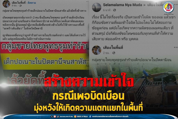 ตามที่ได้มีสื่อสังคมออนไลน์ “เสียงในพื้นที่” พยายามนำเสนอข้อความบิดเบือนทางเพจเฟสบุ๊ค โดยมีความมุ่งหวัง เพื่อให้เกิดความแตกแยก และเกิดความเกลียดชังทางความรู้สึกระหว่างประชาชนที่นับถือศาสนาพุทธและศาสนาอิสลามในพื้นที่จังหวัดชายแดนภาคใต้ โดยเพจดังกล่าวได้โพสต์รูปและระบุข้อความว่า “กลุ่มชายไทยพุทธรุมทำร้ายเด็กปอเนาะในปัตตานีจนสาหัส แล้วยัดทิ้งข้างทาง เกิดเหตุชายฉกรรจ์มากกว่า 2 คน ซึ่งเป็นคนไทยพุทธ รุมทำร้ายเด็กนักเรียนปอเนาะจากอำเภอรือเสาะ จังหวัดนราธิวาส จนได้รับบาดเจ็บสาหัสและสลบ หลังจากนั้นผู้ก่อเหตุนำผู้บาดเจ็บยัดขึ้นรถพ่วงข้างไปทิ้งไว้ข้างทางแถวพื้นที่ “มะพร้าวต้นเดียว” ในจังหวัดปัตตานี ญาติของเหยื่อระบุว่าถูกทำร้ายร่างกายในบริเวณดังกล่าว และได้แจ้งความไว้แล้ว แต่ดูเหมือนคดีจะไม่มีการดำเนินการต่อ