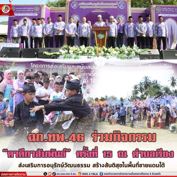 เมื่อวันที่ 12 เมษายน 2568 เวลา 09.00 น. พันเอกสิทธิชัย บำรุงเขต ผู้บังคับหน่วยเฉพาะกิจกรมทหารพรานที่ 46 พร้อมด้วย ร้อยเอกพัฒนาวุฒิ สังข์สุวรรณ หัวหน้าฝ่ายกิจการพลเรือน หน่วยเฉพาะกิจกรมทหารพรานที่ 46 ผู้บังคับกองร้อยทหารพรานที่ 4602 และชุดปฏิบัติการกิจการพลเรือน ร่วมพิธีเปิดกิจกรรม “ตาดีกาสัมพันธ์” ตำบลเรียง ครั้งที่ 15 ประจำปี 2568 ณ สนามกีฬาบ้านซือเลาะ หมู่ที่ 4 ตำบลเรียง อำเภอรือเสาะ จังหวัดนราธิวาส โดยมีนายนิซายาดีย์ หลีตอสัน ผู้อำนวยการสำนักงานการศึกษาเอกชนอำเภอรือเสาะ ให้เกียรติเป็นประธานในพิธี