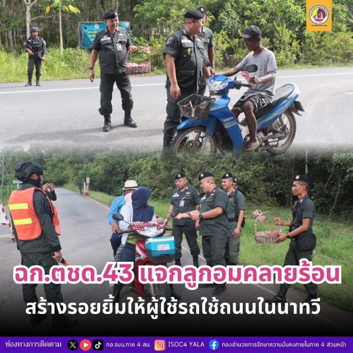 Pada 15 April 2025 jam 14.00 petang, di hadapan Pejabat Daerah Na Thawi, di depan Pangkalan Operasi Kompeni Pasukan Tindakan Khas Sempadan 431 dan Unit Khas 4312, Daerah Na Thawi, Wilayah Songkhla — Pol. Lt. Col. Theerachot Pathomwanichka, Komander Pasukan Tindakan Khas Sempadan 43 bersama Pol. Capt. Phongsak Kaewdam, Komander Kompeni 431, dan Pol. Lt. Jare Kaewchim, Timbalan Ketua Bahagian Risikan, turun padang mengagihkan “gula-gula” kepada pengguna jalan raya yang melalui kawasan tersebut sempena perayaan Songkran.