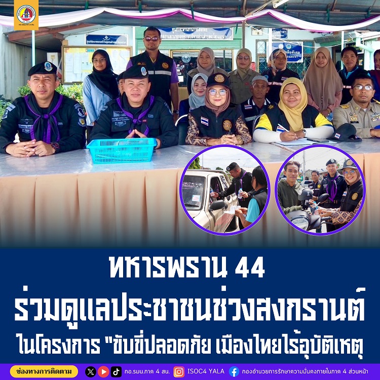 ทั้งนี้ หน่วยเฉพาะกิจกรมทหารพรานที่ 44 ยังคงยึดมั่นในการทำงานเพื่อประชาชน เดินหน้าดูแลความปลอดภัยในทุกเทศกาลสำคัญ เพื่อสร้างความมั่นใจ ความอบอุ่นใจให้กับประชาชนอย่างต่อเนื่อง