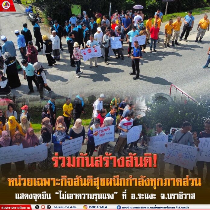 The Peacekeeping Task Force, through Peacekeeping Unit 402, in collaboration with the 45th Ranger Regiment Task Force, community leaders, the Tanyongmas Subdistrict Protection Unit (Chor.Kor.Tor.), local residents, and government agencies in Tanyongmas Subdistrict, Rangae District, Narathiwat Province, organized an activity to publicly reject violence at Wat Chairattaram (Wat Ban Thai), Village No. 3, Ban Thai, Tanyongmas Subdistrict. The event aimed to promote peaceful approaches and send a clear message to society that the local people oppose all forms of violence. Public relations materials were also created to foster understanding, support positive communication within the community, and drive the southern border region towards long-term peace.
