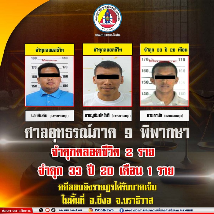 Court of Appeals Region 9 Sentences Two to Life Imprisonment – Another Receives 33 Years and 20 Months for Attempted Shooting of Civilian in Yi-ngo District, Narathiwat