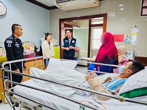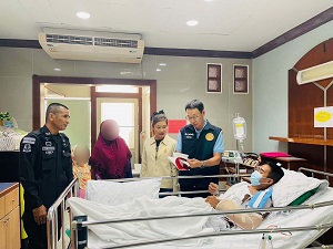 On April 18, 2025, at 1:00 PM, at Songklanagarind Hospital, Kho Hong Subdistrict, Hat Yai District, Songkhla Province, Major Natthaphon Prachonkarn, Chief of Staff of the 49th Ranger Regiment Task Force, welcomed Mr. Phichit Rungprasert, Chanae District Chief, who visited to offer moral support and check on the condition of Volunteer Ranger Muhammad Aropat Pi, a soldier from Ranger Company 4914. He was injured in an ambush by unidentified assailants using unknown firearms during a mission at the opening ceremony of the “Poh Soh” event at Ban Mohturo Mosque, Village No. 2, Chanae Subdistrict, Chanae District, Narathiwat Province, on March 28, 2025.