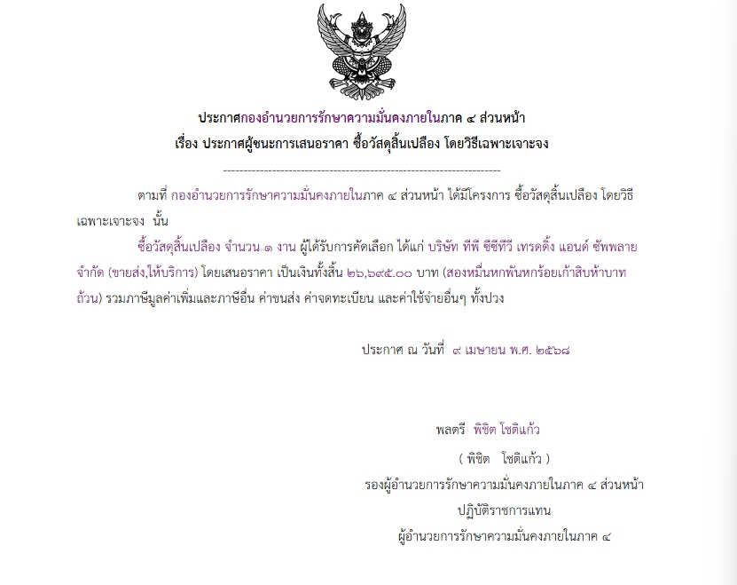 ประกาศผู้ชนะการเสนอราคา ซื้อวัสดุสิ้นเปลือง โดยวิธีเฉพาะเจาะจง