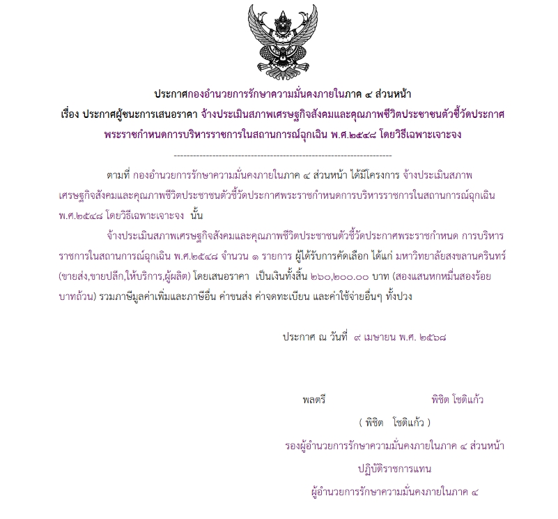 จัดซื้อ จัดจ้างประกาศผู้ชนะการเสนอราคา ประกาศผู้ชนะการเสนอราคา จ้างประเมินสภาพเศรษฐกิจสังคมและคุณภาพชีวิตประชาชนตัวชี้วัดประกาศ พระราชกำหนดการบริหารราชการในสถานการณ์ฉุกเฉิน พ.ศ.๒๕๔๘ โดยวิธีเฉพาะเจาะจง April 22, 2025 225 Share Facebook Twitter Google+ Telegram LINE