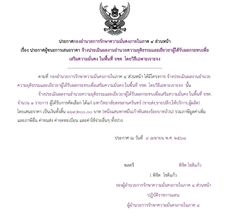 จัดซื้อ จัดจ้างประกาศผู้ชนะการเสนอราคา ประกาศผู้ชนะการเสนอราคา จ้างประเมินผลงานอำนวยความยุติธรรรมและเยียวยาผู้ได้รับผลกระทบเพื่อ เสริมความมั่นคง ในพื้นที่ จขต. โดยวิธีเฉพาะเจาะจง April 22, 2025 148 Share Facebook Twitter Google+ Telegram LINE