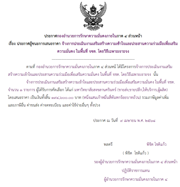 จัดซื้อ จัดจ้างประกาศผู้ชนะการเสนอราคา ประกาศผู้ชนะการเสนอราคา จ้างการประเมินงานเสริมสร้างความเข้าใจและประสานความร่วมมือเพื่อเสริม ความมั่นคง ในพื้นที่ จชต. โดยวิธีเฉพาะเจาะจง April 22, 2025 151 Share Facebook Twitter Google+ Telegram LINE