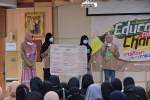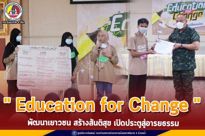สำหรับโครงการ “Education For Change : การศึกษานำมาสู่การเปลี่ยนแปลง” รุ่นที่ 27 ประจำปี 2564 จัดขึ้นโดยหน่วยเฉพาะกิจสันติสุข กองอำนวยการรักษาความมั่นคงภายในภาค 4 ส่วนหน้า ร่วมกับสมาคมสร้างสรรค์เยาวชนชายแดนใต้ (กลุ่มสานฝัน) จัดขึ้นเพื่อพัฒนาศักยภาพเยาวชนด้วยการศึกษา ผ่านกิจกรรมติวข้อสอบด้านวิชาการ เทคนิคการทำข้อสอบ แนะแนวทางการศึกษาต่อในระดับอุดมศึกษา เพื่อให้เยาวชนตระหนักต่อการเรียนรู้ ตลอดจนสร้างแรงบันดาลใจในการตั้งเป้าหมายอนาคต เพื่อเตรียมความพร้อมการใช้ชีวิตในรั้วมหาวิทยาลัย ท่ามกลางความหลากหลายในสังคมพหุวัฒนธรรม