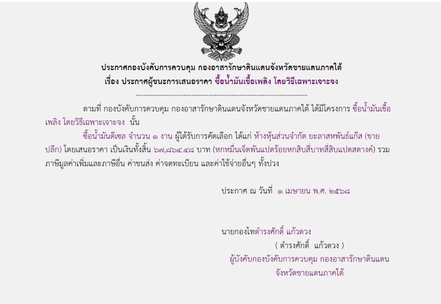 ประกาศผู้ชนะการเสนอราคา ชื้อน้ำมันเชื้อเพลิง โดยวิธีเฉพาะเจาะจง