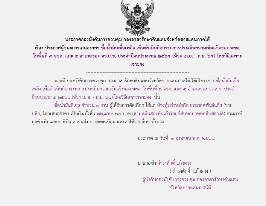 จัดซื้อ จัดจ้างประกาศผู้ชนะการเสนอราคา ประกาศผู้ชนะการเสนอราคา ซื้อน้ำมันเชื้อเพลิง เพื่อดำเนินกิจกรรมการประเมินความเข้มแข็งของ ชดต. ในพื้นที่ ๓ จขต. และ ๔ อำเภอของ จว.ส.ข. ประจำปีงบประมาณ ๒๕๖๘ (ห้วง เม.ย. – ก.ย. ๖๔) โดยวิธีเฉพาะ เจาะจง April 24, 2025 217 Share Facebook Twitter Google+ Telegram LINE