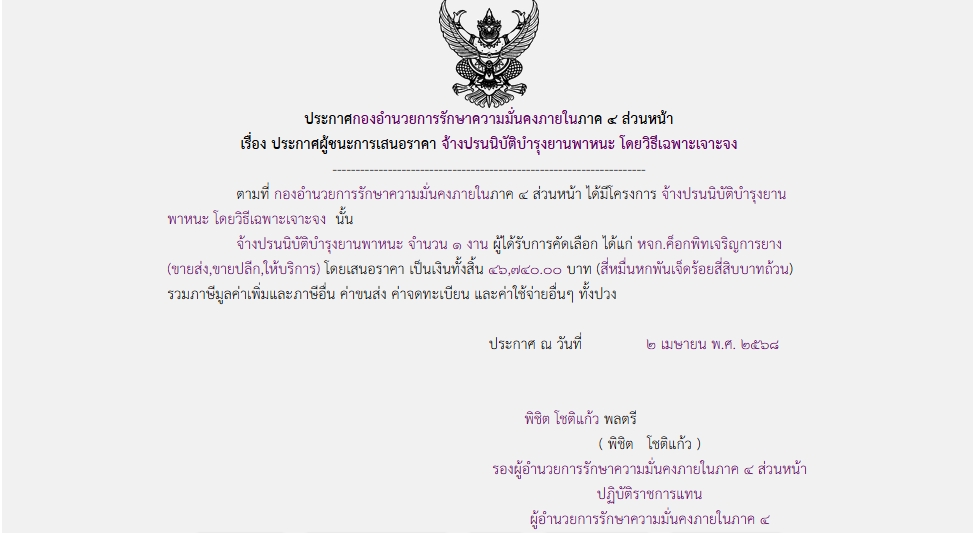 ประกาศผู้ชนะการเสนอราคา จ้างปรนนิบัติบำรุงยานพาหนะ โดยวิธีเฉพาะเจาะจง