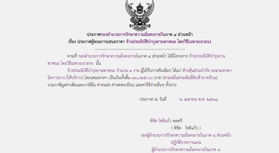 ประกาศผู้ชนะการเสนอราคา จ้างปรนนิบัติบำรุงยานพาหนะ โดยวิธีเฉพาะเจาะจง