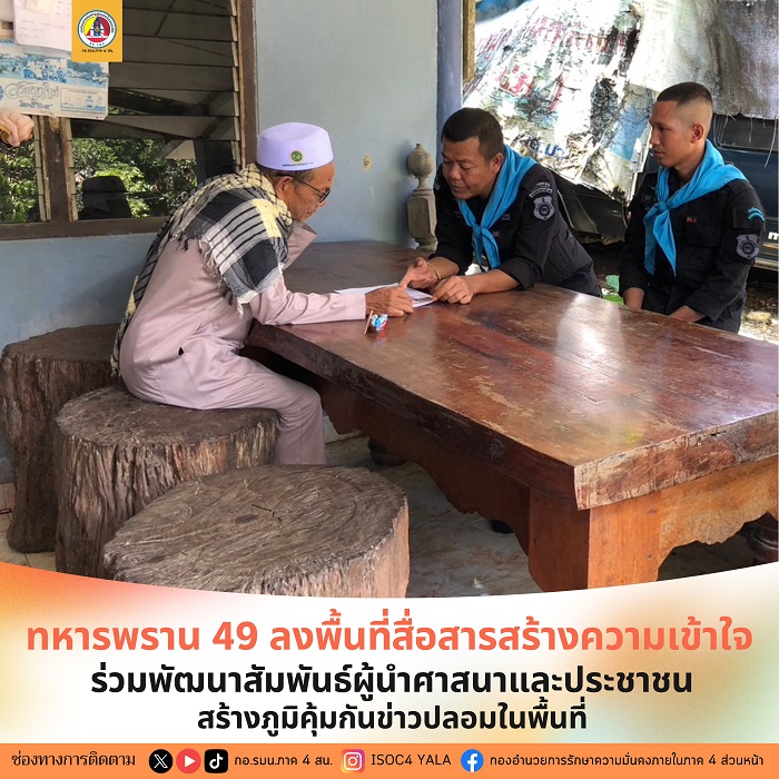Pada 25 April 2025, Pasukan Tugas Khas Rejimen Renjer Sempadan ke-49 menggerakkan anggota dari beberapa kompeni di daerah Chanae, Wilayah Narathiwat untuk melaksanakan misi memperkukuhkan kefahaman, membina hubungan dan memperkukuh keselamatan di peringkat komuniti. Tumpuan diberikan kepada pertemuan dengan pemimpin agama dan masyarakat bagi menyampaikan maklumat yang sahih dan mencegah penyebaran maklumat palsu di media sosial yang boleh menimbulkan perpecahan.