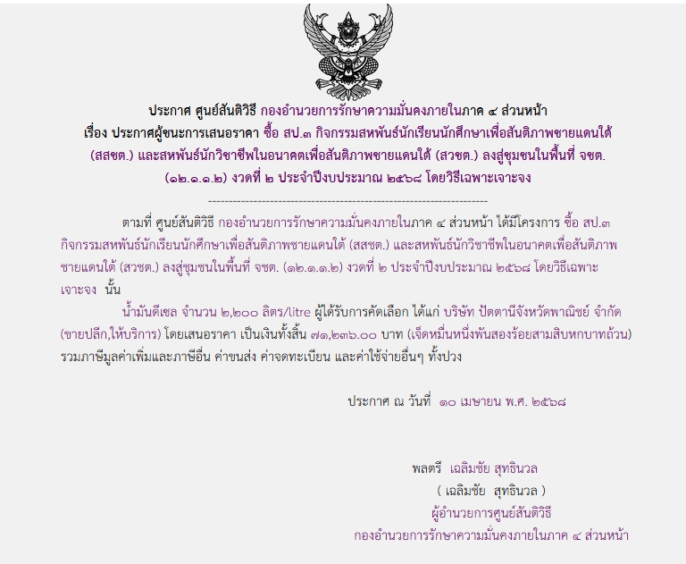 จัดซื้อ จัดจ้างประกาศผู้ชนะการเสนอราคา ประกาศผู้ชนะการเสนอราคา ซื้อ สป.๓ กิจกรรมสหพันธ์นักเรียนนักศึกษาเพื่อสันติภาพชายแดนใต้ (สสขต.) และสหพันธ์นักวิชาชีพในอนาคตเพื่อสันติภาพชายแดนใต้ (สวชต.) ลงสู่ชุมชนในพื้นที่ จชต. April 27, 2025 213 Share Facebook Twitter Google+ Telegram LINE
