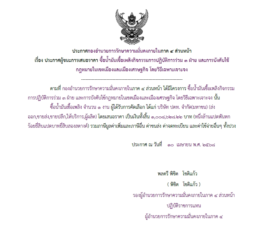 จัดซื้อ จัดจ้างประกาศผู้ชนะการเสนอราคา ประกาศผู้ชนะการเสนอราคา ซื้อน้ำมันเชื้อเพลิงกิจกรรมการปฏิบัติการร่วม ๓ ฝ่าย และการบังคับใช้ กฎหมายในเขตเมืองและเมืองเศรษฐกิจ โดยวิธีเฉพาะเจาะจง April 29, 2025 218 Share Facebook Twitter Google+ Telegram LINE